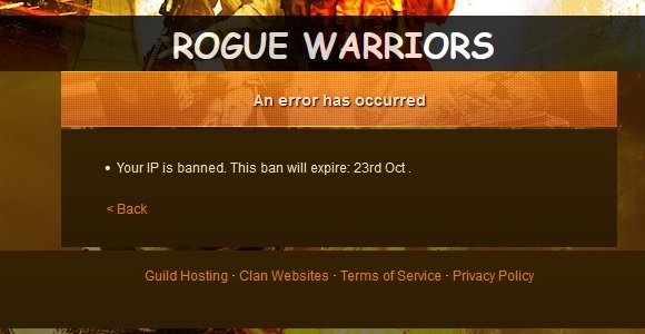 Also, when I got banned I tried to go to your website (Is it Rouge Warriors?), and I was banned from that also? (Image provided below.) So I could not even ask what happened nor get in touch with an admin. Because of this I had to make a post here in the "public forums" to find out why. Yes I could have walked away but since I had not done anything wrong I will stand up for myself and even others at times.